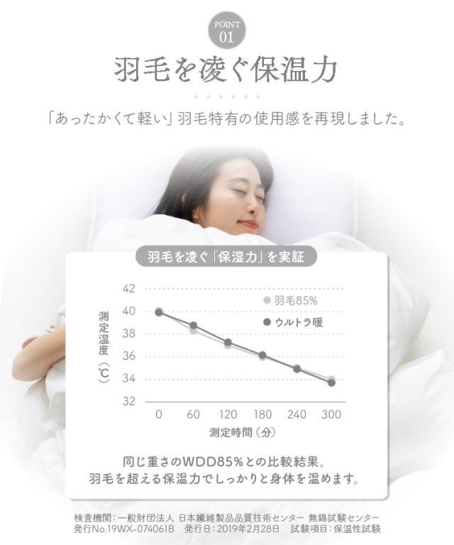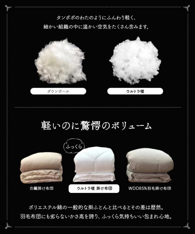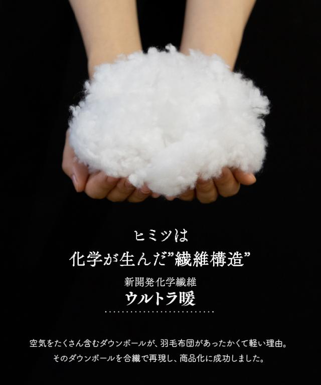 ウルトラ暖の繊維は、羽毛の繊維構造の研究を踏まえ、様々な特性の異なる繊維を独自の配合でブレンドし、人工的に疑似羽毛を作り出しふとん内部に空気層を作り高い保温力を実現しています。