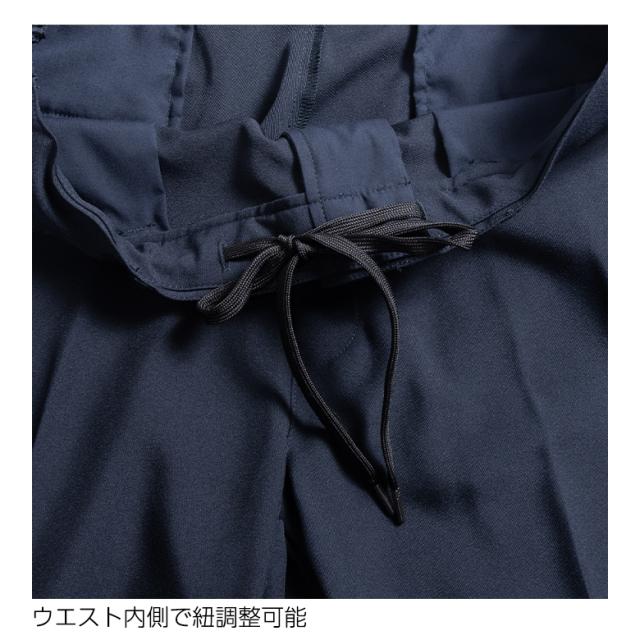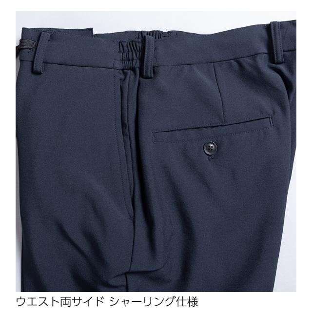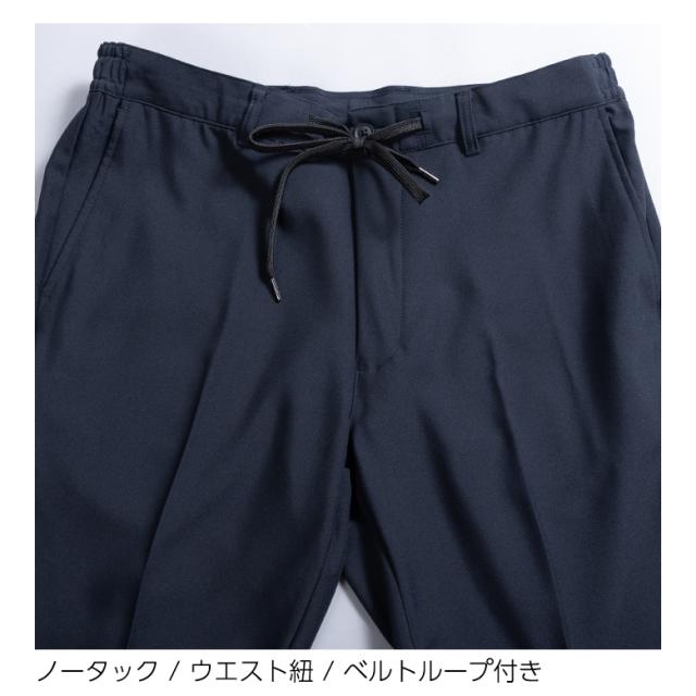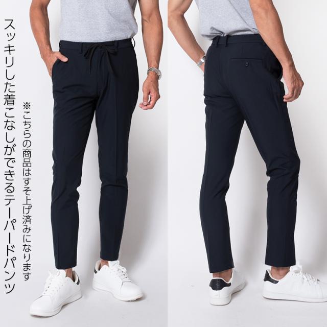 ウエストゴムで快適な履き心地。テーパードシルエットがスマートにキマり、