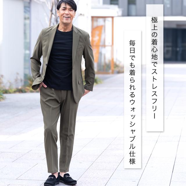 【キーワード】 メンズ カジュアルスーツ スリムスーツ セットアップスーツ テレワーク リモートワーク 在宅ワーク 出張 旅行 トラベル ジャケット ジャケパン カジュアル オフィス ビジネス ビジカジ ゴルフ 休日 スリム テーパードパンツ シャーリング ストレッチ 伸縮素材 シングル2ボタン ネイビー 濃紺 秋冬 春夏 カーキ チャコールグレー