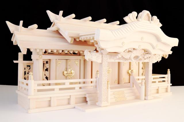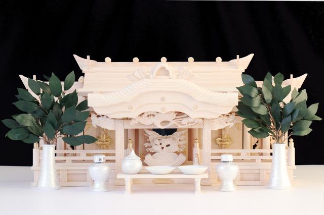 ご好評を頂いております昇龍大社シリーズの新色は、特殊な天然樹脂塗装を施し、年月を経ても茶ばみ変色を抑える、当店オリジナル「純白神棚」シリーズの仕上がり。乾燥後はパール調に輝く吹付け塗装を重ねた、とても手の込んだ作りです。美しく力強く、白龍が輝く神棚となっています。 |