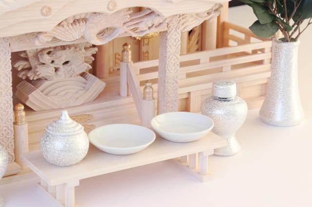 付属の神具陶器はいぶし銀の神具がセット。国内唯一の窯元で作成される希少な国産陶器。硬質に輝く表面仕上げは光の当たり方の加減により、異なる輝きを見せてくれます。八足台、神鏡の台座はお社本体と同色塗装が施されています。 |