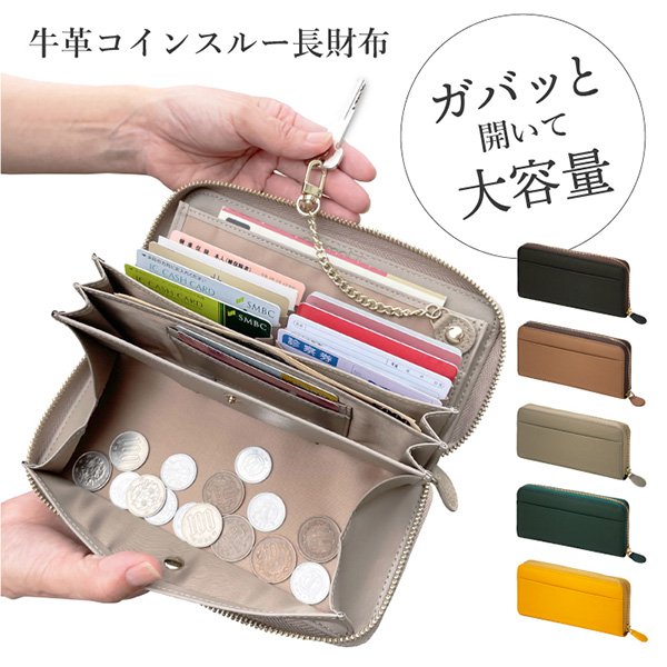 牛革コインスルー長財布‐牛革 財布 コインスルー 本革財布 レディース メンズ 長財布 本革 本牛革 カード 大容量 ラウンドファスナー 黒 ブラック レザー マット