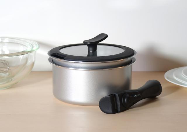 18cmのマルチポットとフライパン、ガラス蓋、専用ハンドルの4点セットです。焼く・炒める・煮ると基本の調理がセット一つで対応できます。お弁当作りや朝食、一人用のおかずなどにさっと使える小さめサイズです。