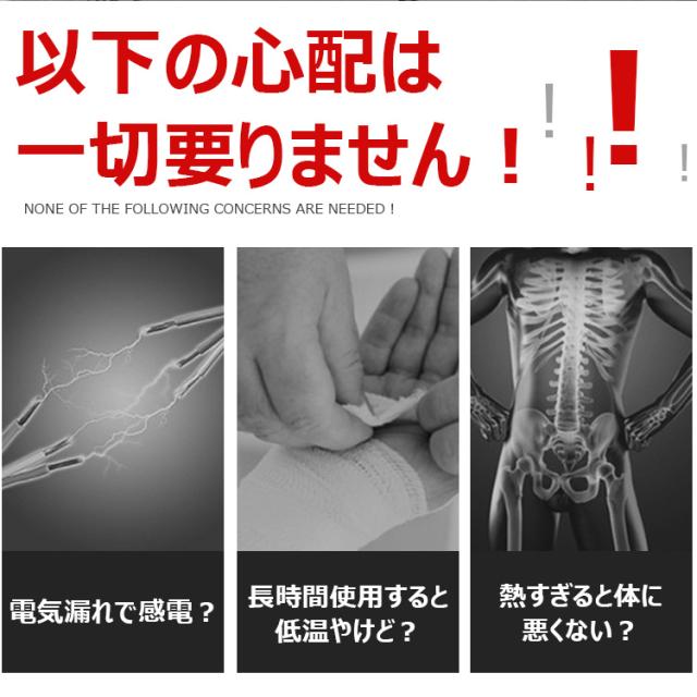 ※乳幼児、お年寄り、ご病気をされている方、自分で電源を外せない方、皮膚感覚の弱い方はご使用をお控えください。