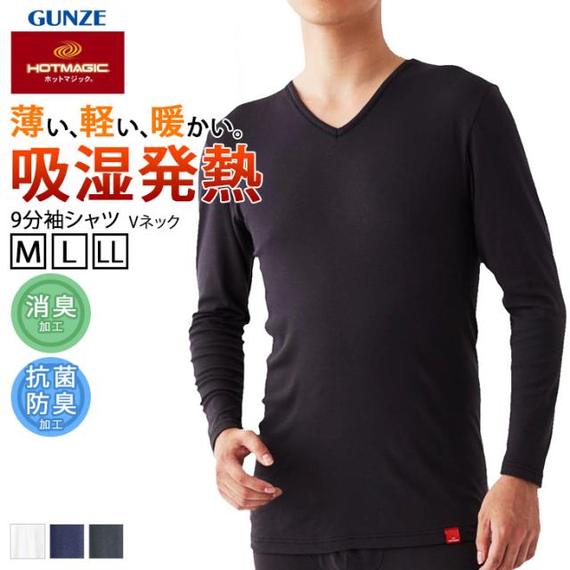 新作 HOTMAGIC ホットマジック 9分袖シャツ Vネック ベトナム製 メンズ トップス 長袖 インナー 抗菌防臭 消臭加工 吸湿発熱 暖かい 男性 紳士 下着 肌着 シンプル 無地 防寒対策 薄手 柔らか 温かい