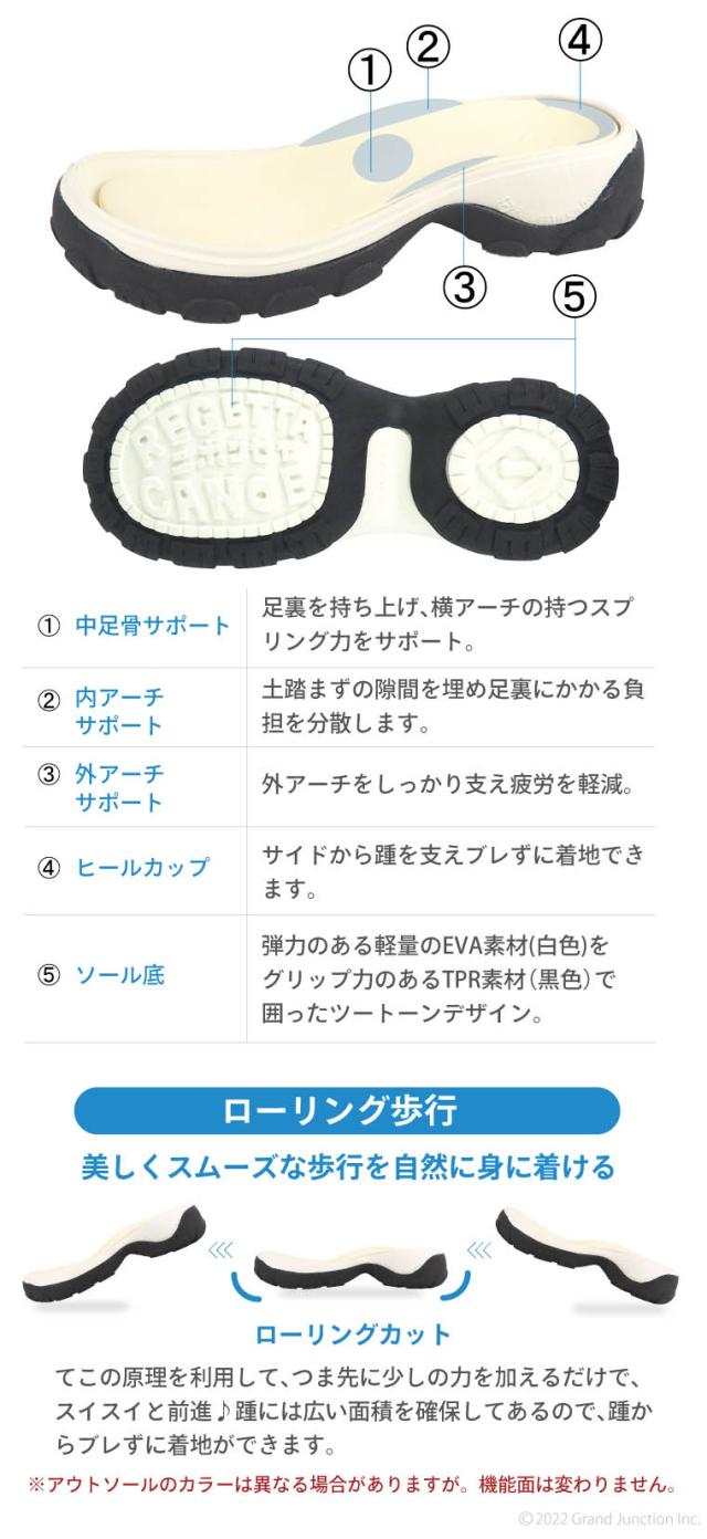 ■インソールは「グミインソール」を採用。凸凹面が足裏に吸い付くように優しくフィットします。 正しい姿勢のサポート、血行促進をサポートし、歩き疲れや冷えの防止にも期待できます。長時間履いていても疲れにくく足元は一日中快適です。