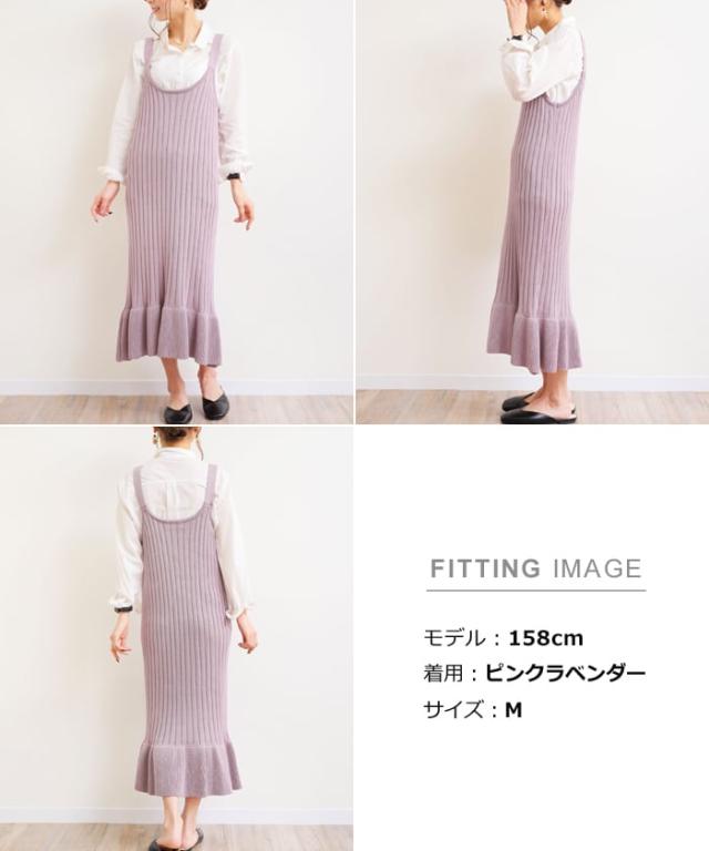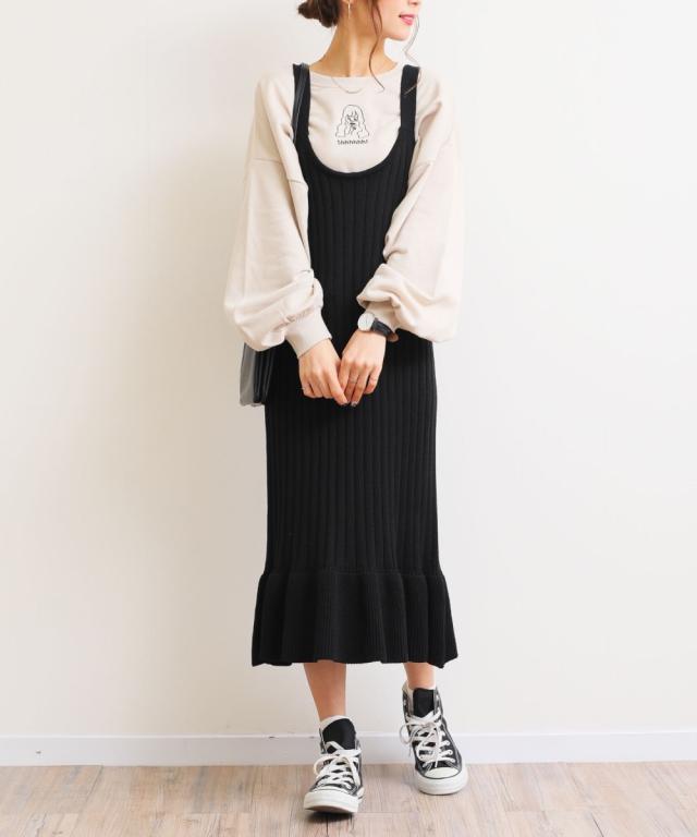 裾フリル ロング丈 リブ ニット キャミワンピース