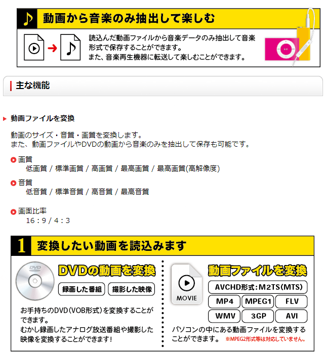 | ディスプレイ | 1024×768以上の解像度で色深度32bit True Color以上の表示をサポートしている環境※画面の解像度が1024×768未満、画面の文字サイズ設定によっては『誰でもできる動画変換6』の画面が正常に表示されません。 |
