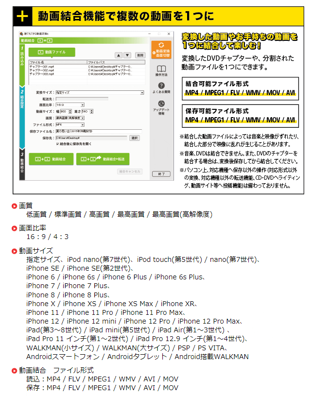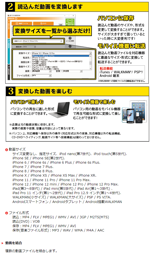 更に最新のiPhone11、iPhone12サイズに合わせたサイズに変換やAVCHD(H.264)ハイビジョン動画の変換にも対応。