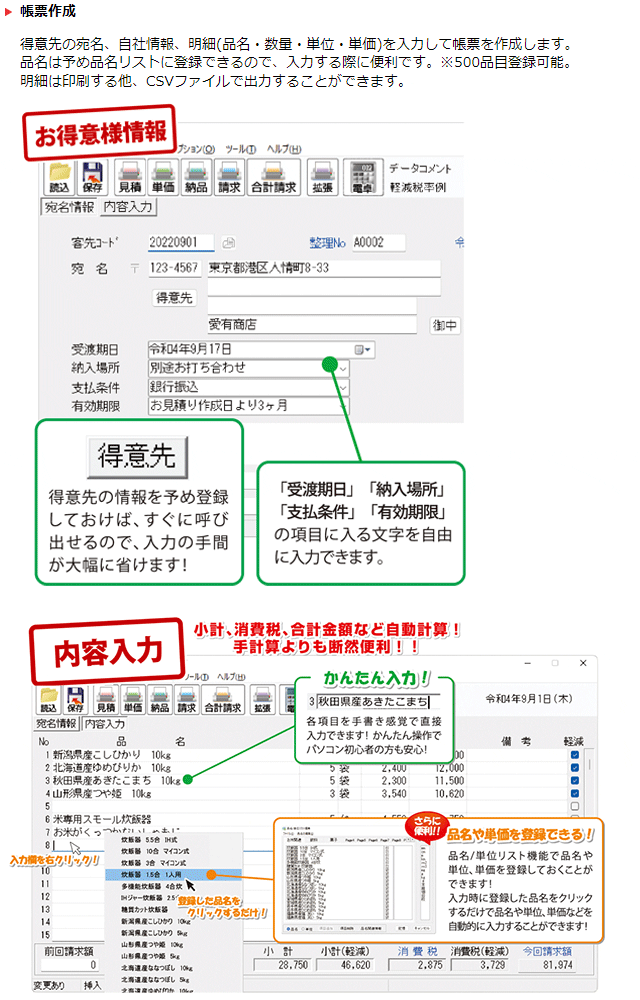 得意先、自社情報、品名など内容を入力すれば、すぐに見積書、納品書、請求書などの帳票を作成して印刷することができます。