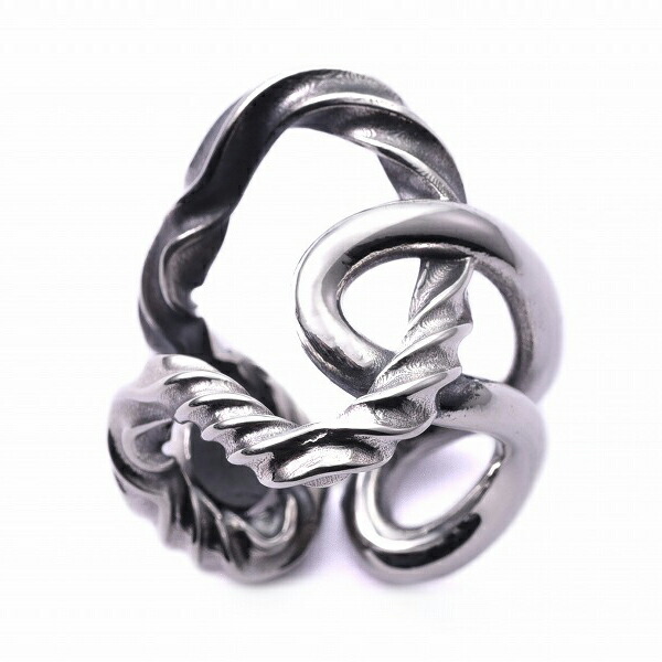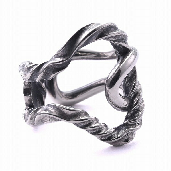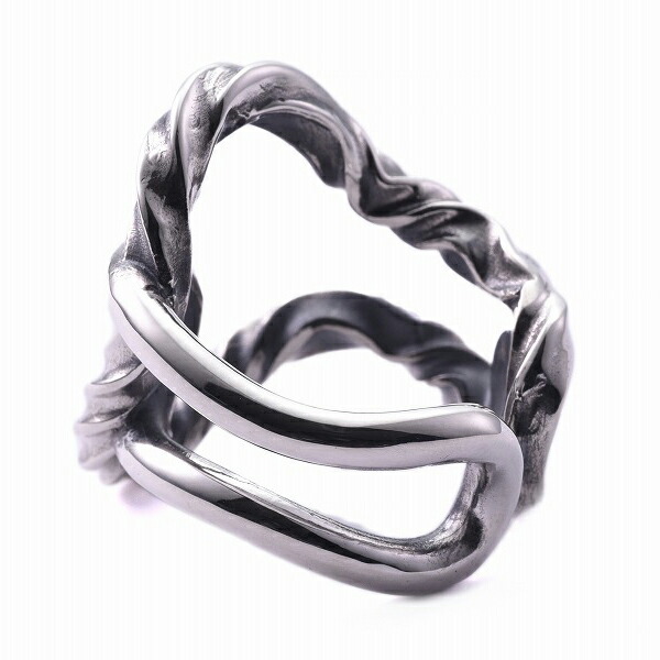 ねじりの効いた陰影の強い銀線と、艶のある丸線が優雅に絡む個性的なリング。
