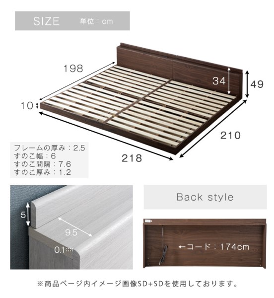 ベッド マットレス付き キング 連結ベッド 幅218 (S+SD) ワイドキング USB・2コンセント付 ローベッド 連結 宮棚 すのこ フレーム マットレス ボンネルコイル ボンネルコイルマットレス キング ベッドフレーム 宮付き