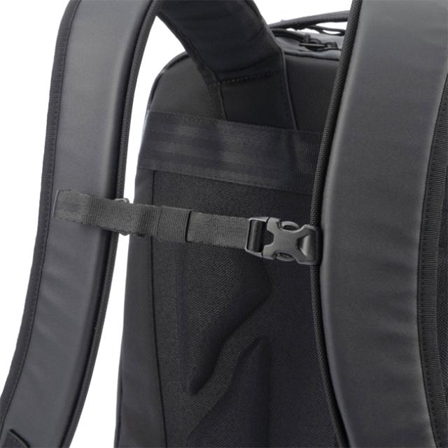 リュックのズレ落ちを防ぎ、高さ調節可能なチェストベルト