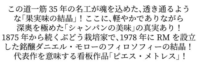 この道一筋35年の名工が魂を込めた、透き通るような「果実味の結晶」!ここに、軽やかでありながら深奥を極めた「シャンパンの美味」の真実あり!1875年から続くぶどう栽培家で、1978年にRMを設立した銘醸ダニエル・モローのフィロソフィーの結晶!代表作を意味する看板作品「ピエス・メトレス」!