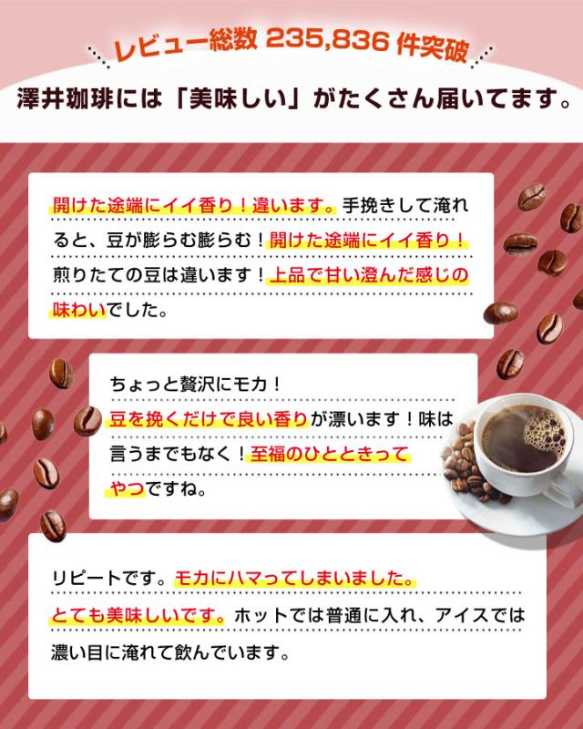 | このコーヒーは、フルーティーな甘い香りが特徴のモカコーヒーで、約100杯分楽しめます。澤井珈琲の特別な焙煎技術で作られており、毎日のコーヒータイムを贅沢で幸せなひとときにしてくれます。 1. フルーティーな甘い香りリッチ@モカ 珈琲文化発祥とも呼ばれる甘く特別な香りのモカを思う存分気軽に楽しんで頂けるお得なセットをご用意しました。 口の中に含むと、まるで果実のような甘美で優雅な香りが口いっぱいに広がります。 澤井珈琲にしかできない、特別な香りと味わいのモカコーヒーを是非ともご堪能ください。 | |