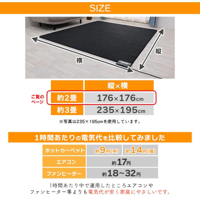 ホットカーペット 遠赤省エネ電気カーペット 暖かい 176×176 秋 冬 暖房器具 暖房 2畳用 あったかグッズ コンパクト収納 こたつ併用可能 接結製法 8時間自動オフ ダニクリーン