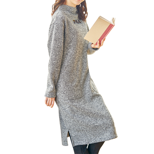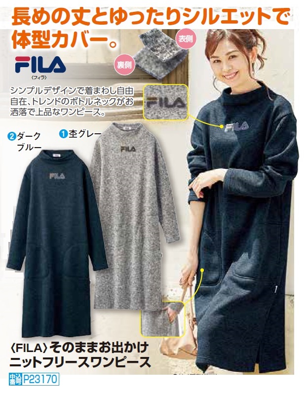 ワンピース 秋冬 フィラ そのままお出かけ ニットフリースワンピース 全2色 ワンピース ニットワンピース ミモレ丈 ネイビー グレー レディース 婦人服 ミセス シニア 女性 シンプル ロゴ シニアファッション 50代 60代 70代 母の日 fri p23170