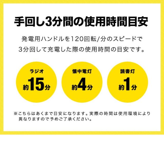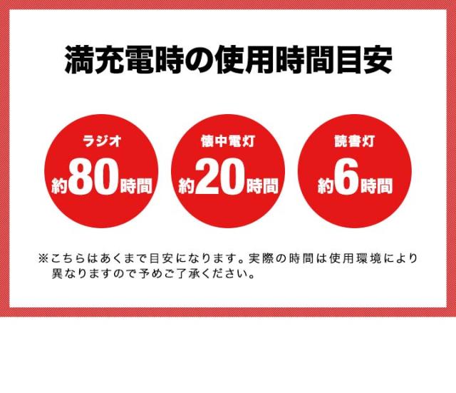 | 満充電時のバッテリー持続時間: ・ラジオ:(約)80時間 ・懐中電灯:(約)20時間 ・読書灯:(約)6時間 ・ラジオ+懐中電灯:(約)15時間 ・ラジオ+読書灯:(約)5時間 |