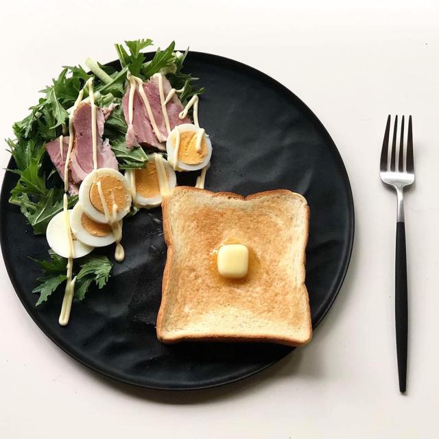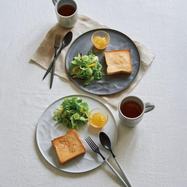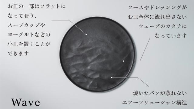 よく見ると皿の一部(写真だとお皿の上側)はフラットになっており、スープカップやヨーグルトなどの小皿を置くことができます。ソースやドレッシングがお皿全体に流れ出さないウェーブのカタチになっています。