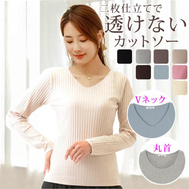 透けない 前身頃2重 カットソー Tシャツ レディース 長袖 ダブルフロント リブ コットン 綿 無地 スーツ インナー 白 Vネック 丸首 シームレス 胸部分2重 裏地付き シンプル 仕事 きれいめ オフィス リクルート ユニフォーム 制服