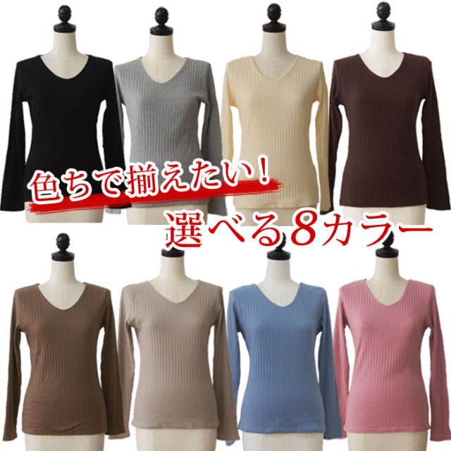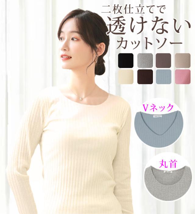 透けない 前身頃2重 カットソー Tシャツ レディース 長袖 ダブルフロント リブ コットン 綿 無地 スーツ インナー 白 Vネック 丸首 シームレス 胸部分2重 裏地付き シンプル 仕事 きれいめ オフィス リクルート ユニフォーム 制服