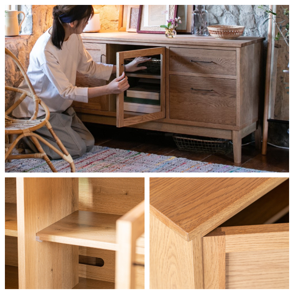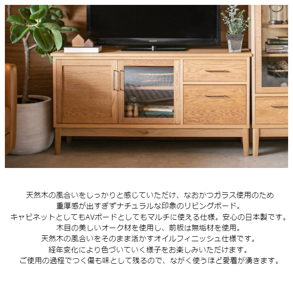 | 説明 | 天然木の風合いをしっかりと感じていただけ、なおかつガラス使用のため 重厚感が出すぎずナチュラルな印象のリビングボード。 キャビネットとしてもAVボードとしてもマルチに使える仕様。安心の日本製です。 木目の美しいオーク材を使用し、前板は無垢材を使用。 天然木の風合いをそのまま活かすオイルフィニッシュ仕様です。 経年変化により色づいていく様子をお楽しみいただけます。 ご使用の過程でつく傷も味として残るので、ながく使うほど愛着が湧きます。 |