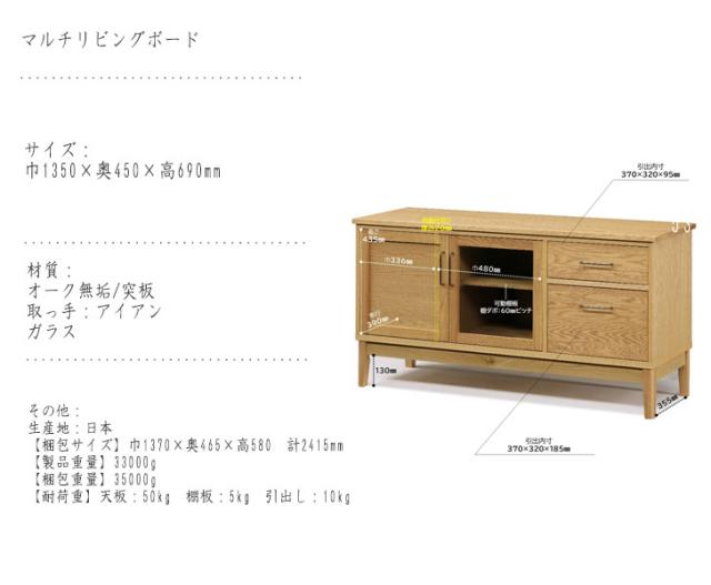 | その他 | 生産地:日本 【梱包サイズ】巾1370×奥465×高580 計2415mm 【製品重量】33000g 【梱包重量】35000g 【耐荷重】天板:50kg 棚板:5kg 引出し:10kg 【注意】 ・イメージ写真の雑貨類は付属しておりません。 ・取っ手・脚はお客様組立となります。 ・同じシリーズで背の高い収納「マルチキャビネット」もご準備がございます。 ・木材について 木目や色味には個体差がございます。天然木の特性としてご理解ください。 オイル仕上げは塗膜がない仕上がりのため、濡れたものを置くと染みになります。 また、濡れてしまった場合はすぐにふき取りをしてください。 アルコール除菌シートなどのご使用で木材が変色する可能性がございますので、 お手入れは乾拭きで行ってください。 |