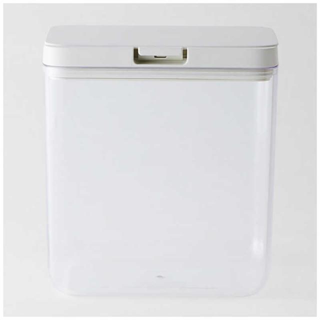パッキンでしっかり閉まって湿気を防ぎ、ワンタッチで開く保存容器。小麦粉1kgが袋ごとピッタリ入るサイズです。