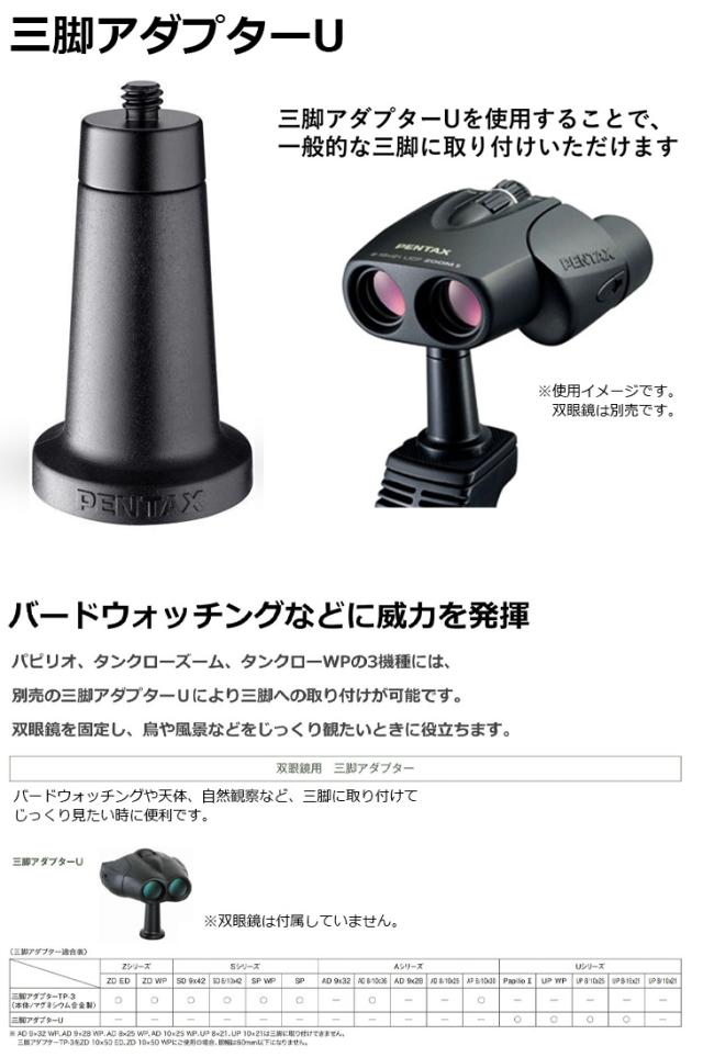 パピリオ、タンクローズーム、タンクローWPの3機種には、別売の三脚アダプターUにより三脚への取り付けが可能です。 双眼鏡を固定し、鳥や風景などをじっくり観たいときに役立ちます。