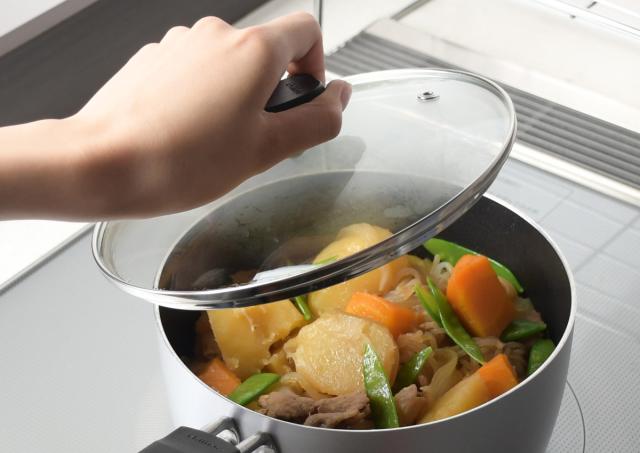 調理中の様子が見えるガラス蓋付きです。適度に蒸気を逃す蒸気穴付きなので、吹きこぼれの心配がありません。