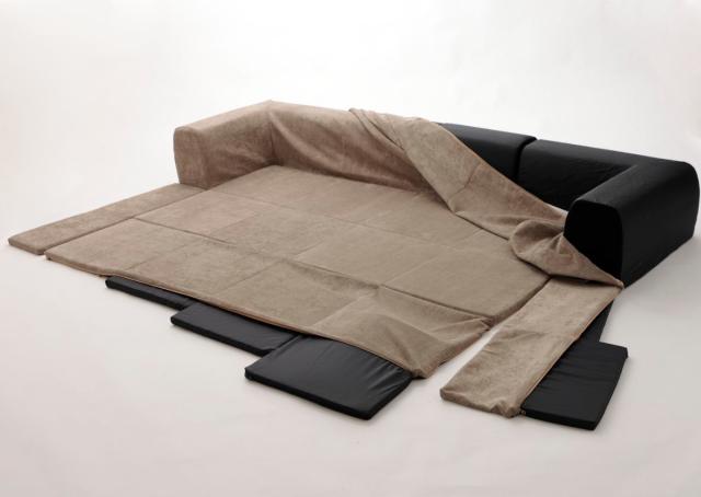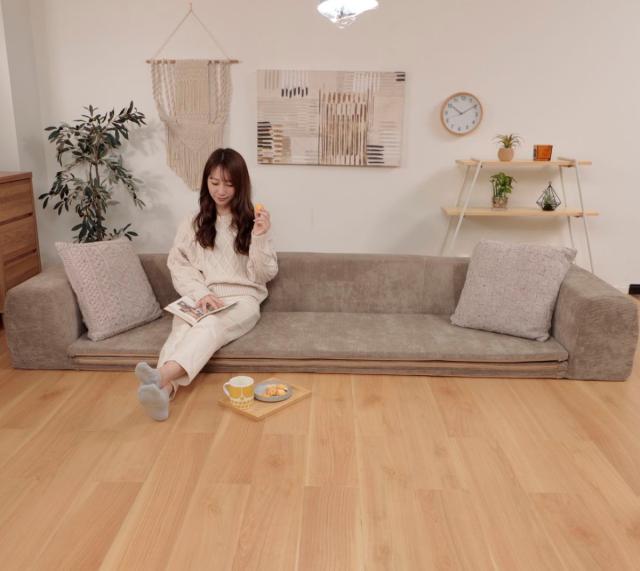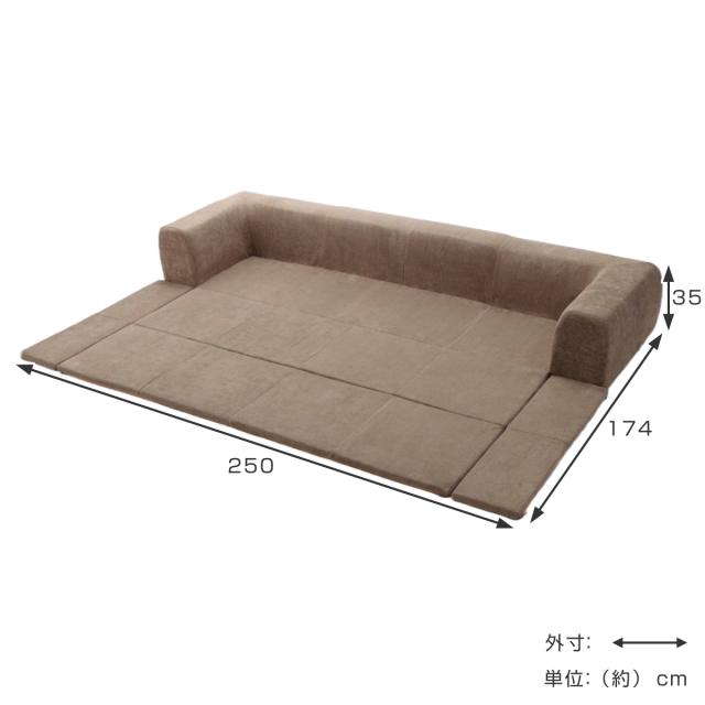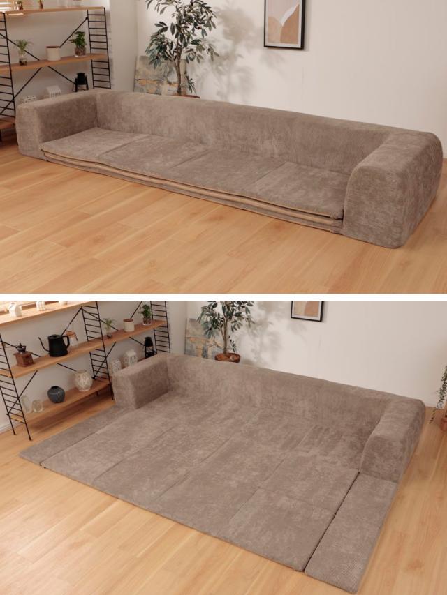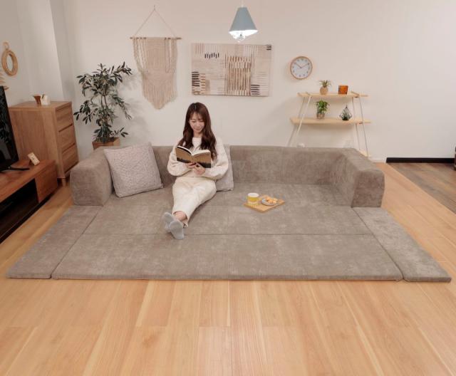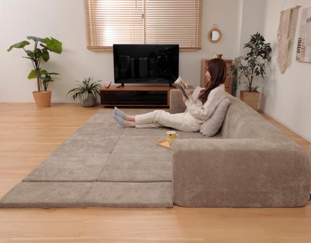 座面を広げるとフロアマットのように広々使え、脚を思いっきり伸ばしてリラックスしたい時やお昼寝時にもぴったりです。マットとソファが一体になっているので、ソファにもたれているうちにズレてしまう心配もありません。