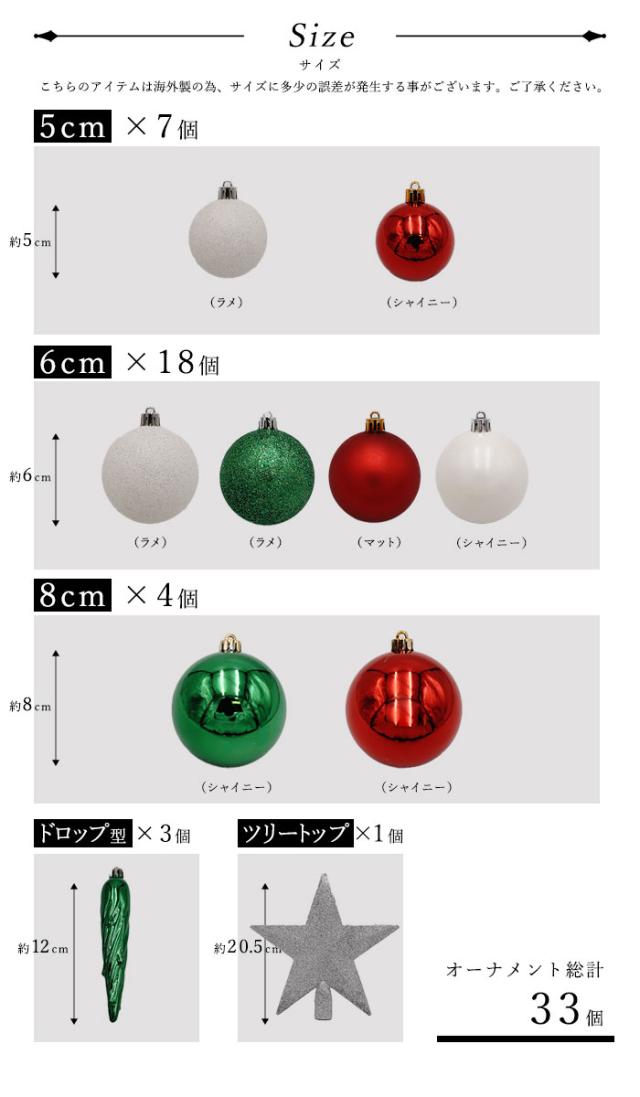 ★「クリスマスツリーをおしゃれに飾り付けたいけど、どんなオーナメントを選んだら良いのか分からない…!」 そんな方へおすすめなのが、こちらのミックスオーナメント。 クリスマスの人気色であるクリスマスカラー(赤・緑・白)のニュアンスの異なる3色ボールと、海外では定番のしずく型オーナメント、トップツリーがセットになった合計33個のオーナメントアソートです。 華やかさもありつつトラディショナルな雰囲気に仕上げてくれるオーナメントセットです。 サイズはオーナメントボールが直径約5cm・直径約6cmの2タイプ、しずく型オーナメントが高さ約12cm、トップスターが高さ約20.5cm 幅約21cmです。33個セットです。 |