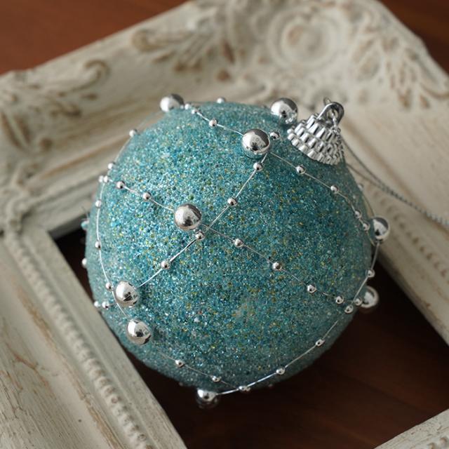 ★夜明け前の『青の世界』を表現した美しいブルーオーブオーナメント。その独特な色彩でクリスマスツリーを幻想的に彩ります。 ボールの表面には凹凸感のあるラメが一面に敷き詰められており、光に反射してキラキラと輝きを放ちます。 緑がかった青色が印象的で、周囲を取り囲むシルバービーズと相まって神秘的な雰囲気を醸し出します。 クリスマスツリーに飾るのはもちろん、玄関先やリビングのインテリアとしてもお使いいただけます。 標準サイズの8cmボールです。 |