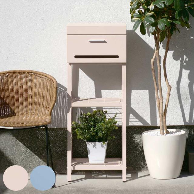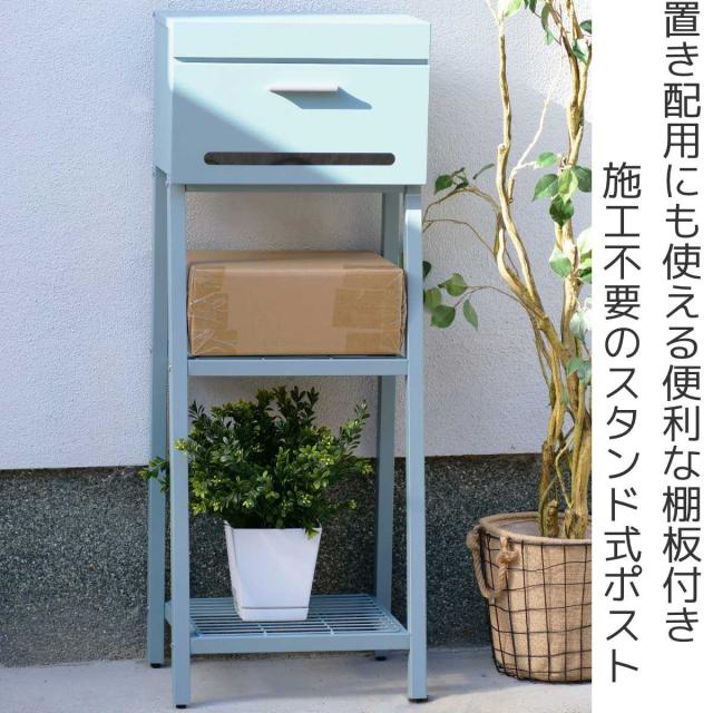 棚板付きの便利なスタンド式ポストです。壁掛け式とは異なり施工の手間がかからず、置くだけで使用可能です。マットな質感のくすみカラーと四角いフォルムのシンプルなデザインが、玄関前をおしゃれに演出します。