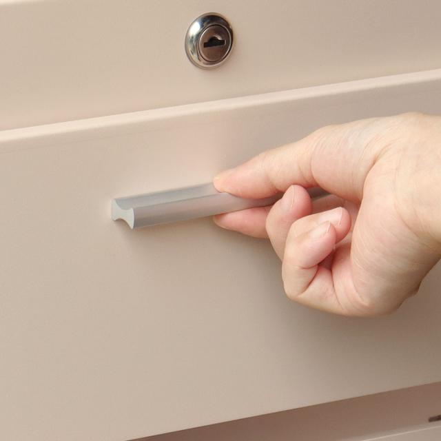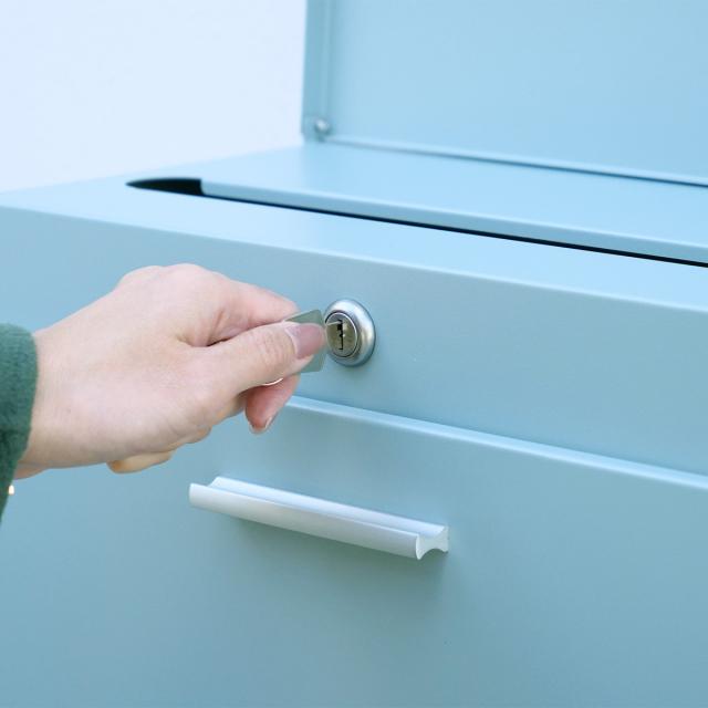 付属の鍵で施錠できます。鍵穴は上蓋で隠れるので防犯面でも安心です。スペアキーが1本ついています。
