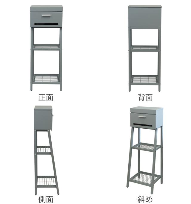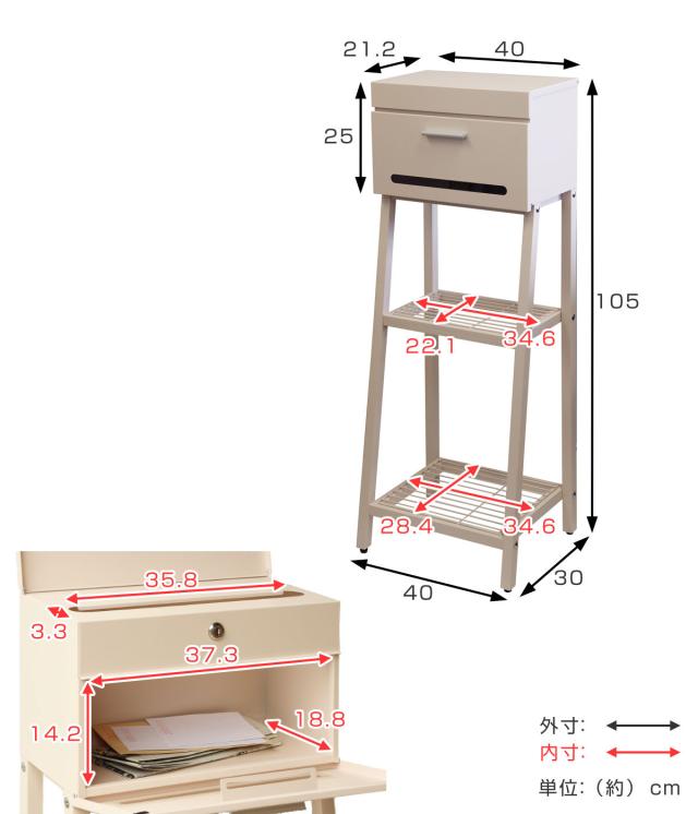| サイズ | 約 幅40×奥行30×高さ105(cm) 郵便入れ本体:約 幅40×奥行21.2×高さ25(cm) 棚板上段:約 幅34.6×奥行22.1(cm) 棚板下段:約 幅34.6×奥行28.4(cm) 投函口:約 幅35.8×奥行3.3(cm) 取出口:約 幅37.3×奥行18.8×高さ14.2(cm) |