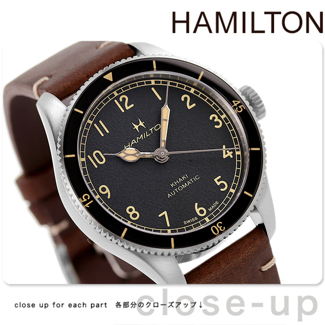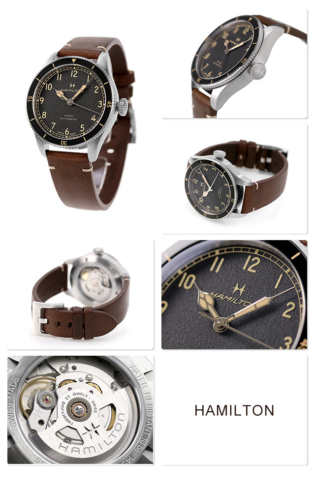 3年保証キャンペーン ハミルトン カーキ アビエーション パイロット パイオニア 38mm スイス製 自動巻き メンズ 腕時計 H76205530 HAMILTON KHAKI AVIATION PILOT PIONEER アナログ ブラック ブラウン 黒 革ベルト ◆HAMILTON(ハミルトン)はアメリカ発祥の老舗ブランドです。創業翌年に誕生した懐中時計「ブロードウェイ・リミテッド」は、他の時計よりも正確に時を刻むことから鉄道用時計として採用されました。その後も航空用時計や軍用時計として採用されるなど、品質の高さと流行にながされない独自のデザインが世界中の人々に支持されています。 第二次世界大戦中アメリカ軍に使用されていた、当時最先端のポケットウォッチ「モデル23」からインスピレーションを得た「カーキ アビエーション パイロット パイオニア」。その独特なデザインは、ハミルトンのアビエーションとミリタリーの歴史へのトリビュートです。大空への憧れを掻き立てる、スポーティで洗練された自動巻きパイロットウォッチです。 機械式腕時計