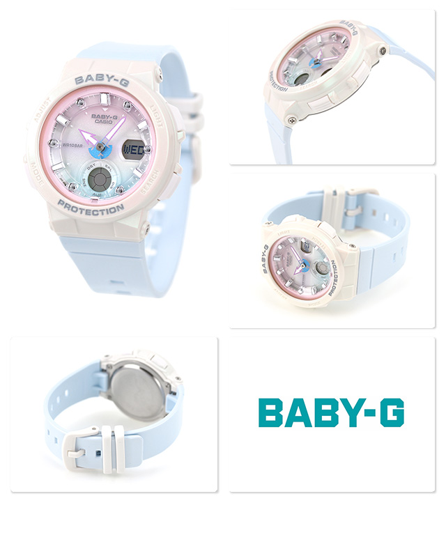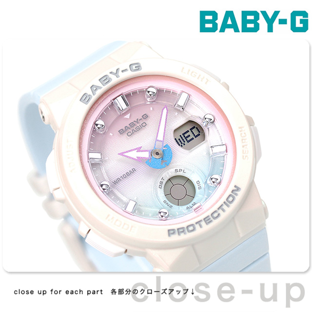 7年保証キャンペーン カシオベビーgベビージーbaby-gビーチトラベラーシリーズ海外モデルクオーツレディース腕時計ブランドBGA-250-7A3DRCASIOBaby-GBeachTravelerアナデジマルチカラーパールブルー夏のビーチシーンを彩るBeachTravelerシリーズに艶やかな貝殻モチーフが登場。太陽の光を美しく反射する貝殻のグラデーションカラーを採用したモデルです。メタリックフェイスの爽やかなカラーグラデーションと反射するアワーマーカーがきらびやかなデザインを演出します。パステルブルーとホワイトのモデルはケースとバンドに偏光塗装を施しビーチをイメージさせる仕上がりになっています。フェイスのエッジには海面を再現した半透明素材を採用。また時分針とインデックスにはボートの舵と錨をイメージしたデザインを採用しビーチアクティビティのモチーフを表現しています。ネオンイルミネーターはブラックライトの光で文字板を発光させ見やすくするものです。点灯させると針がピンクとグリーンに光り夜の海をイメージさせます。日本未発売モデル ギフト プレゼント 記念品 母の日 敬老の日 クリスマス 誕生日 結婚記念日 就職祝い 卒業祝い 還暦祝い 20代 30代 40代 50代 60代