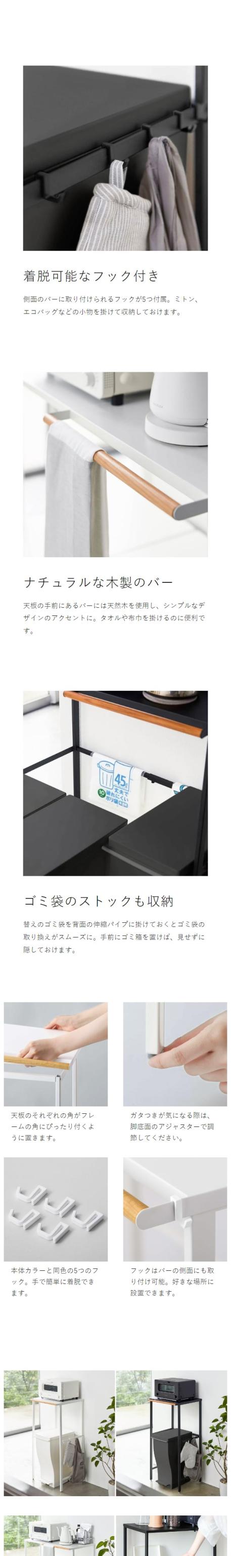 ゴミ箱上の空間を有効活用できる『 tower( タワー )伸縮ゴミ箱上ラック 』。横幅を約42.5〜76cmの間で調節可能な伸縮式なので、ゴミ箱の数やキッチンスペースに合わせてぴったりサイズで設置できます。ペダル式ゴミ箱も開けやすい高さで、天板はトースターや電気ケトルなどのキッチン家電の置き場所に最適。天然木のバーはタオルや布巾などが掛けられ、小物を掛けられるフックが5つ付属です。“ヤマジツ”の愛称で親しまれる山崎実業は、「くらしを整える」商品を提案し続けています。