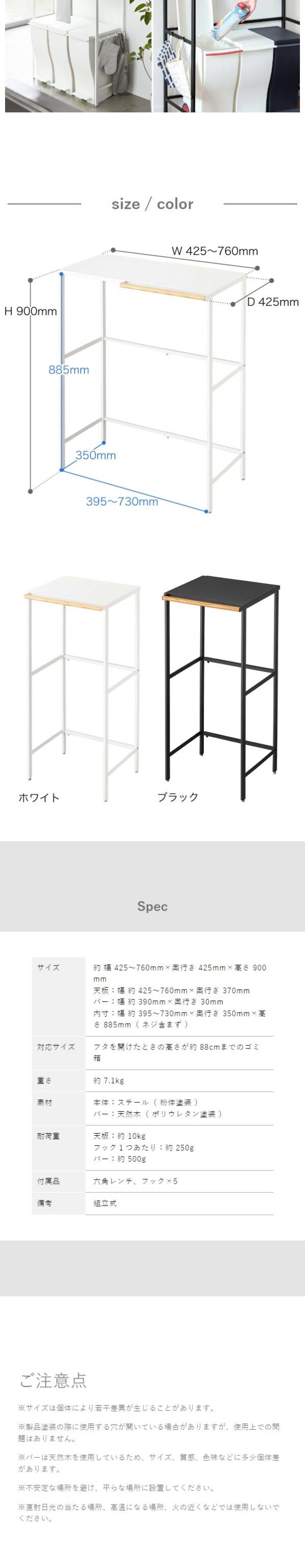 ゴミ箱上の空間を活用できる伸縮ゴミ箱上ラック。横幅を約42.5〜76cmの間で調節できる伸縮式なので、スペースに合わせて設置可能。天板はトースターなどキッチン家電の置き場所に。