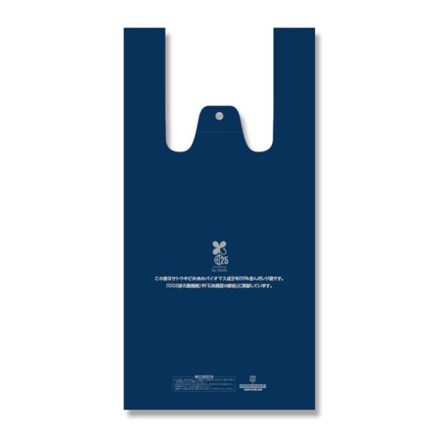 生物由来の有機資源を原料としたバイオマス成分を25%含んだレジ袋です。中身が透けにくい紺色。バイオマスマーク取得済みで、「プラスチック製買物袋有料化制度」の対象外とすることが可能です。主原料のサトウキビは、育成時に光合成をして大気中のCO2を吸収するため、石油化学由来の原料と比較すると大幅なCO2の削減に貢献します。東日本12号/西日本30号に準じた規格となりますが、サイズは若干異なりますのでご注意ください。