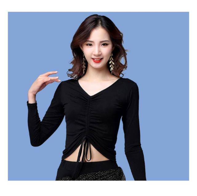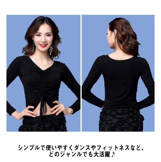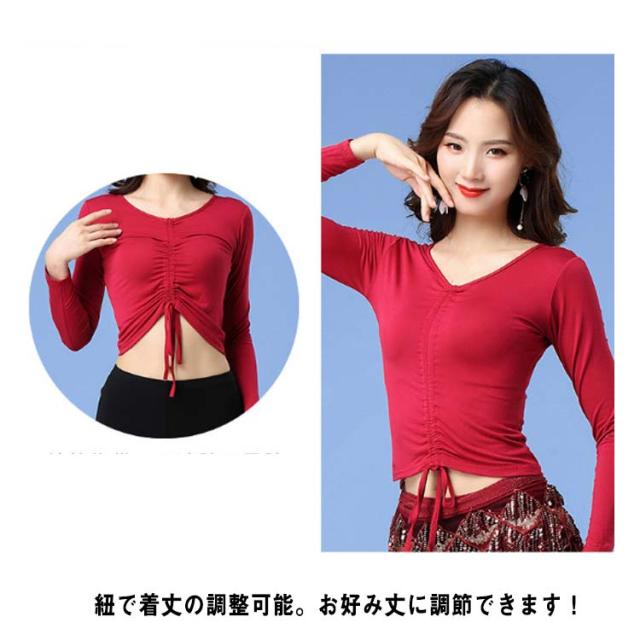 ダンストップス ダンス衣装 ベリーダンス 社交ダンス レディース トップス 上着 長袖 Vネック シャーリング お腹ちょい見せ チラ見せ ダンス着 レッスン着 練習 舞台 演出 モーダル生地 レーヨン 無地 全2色