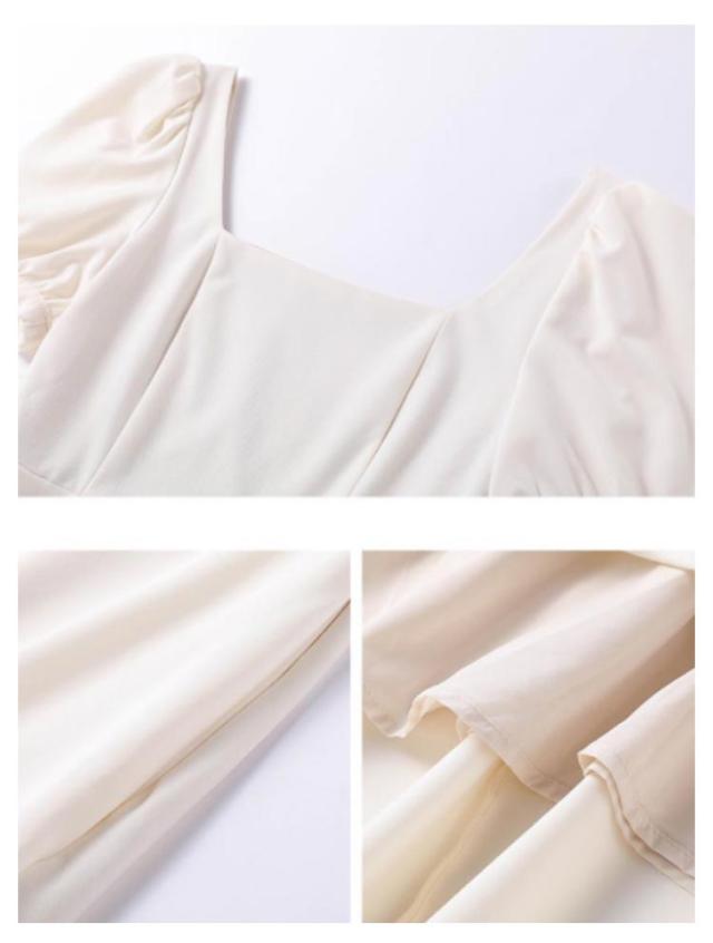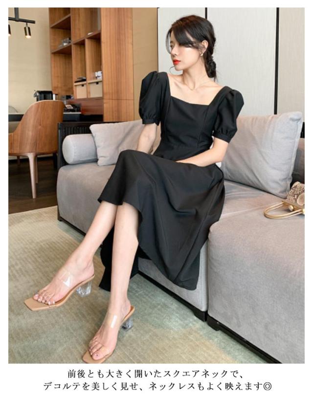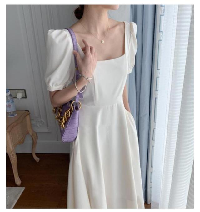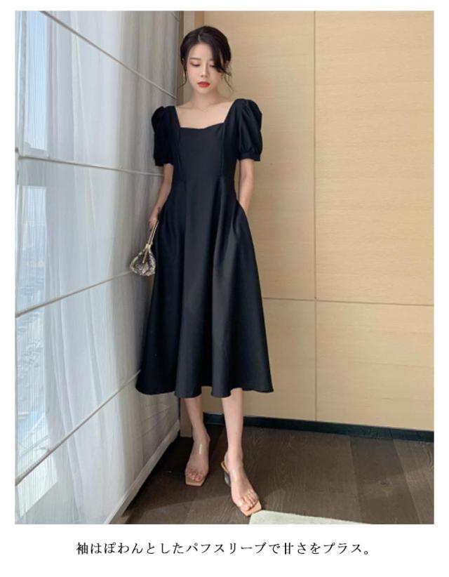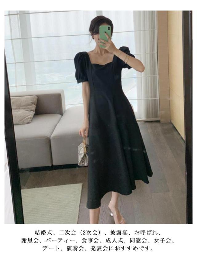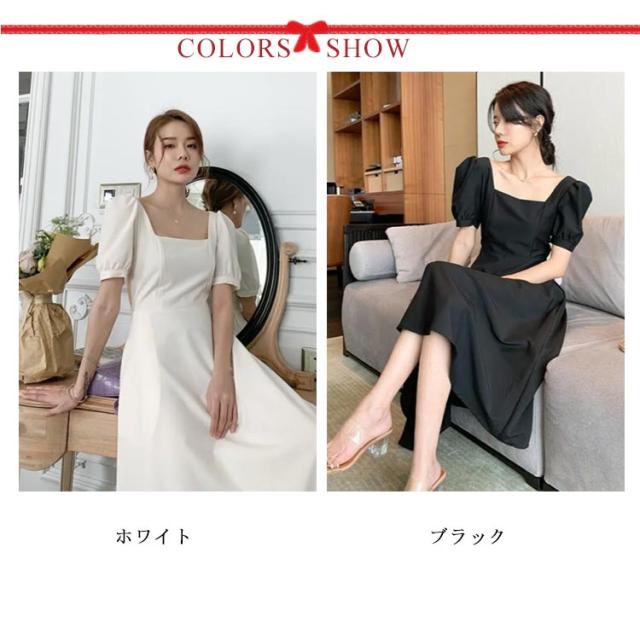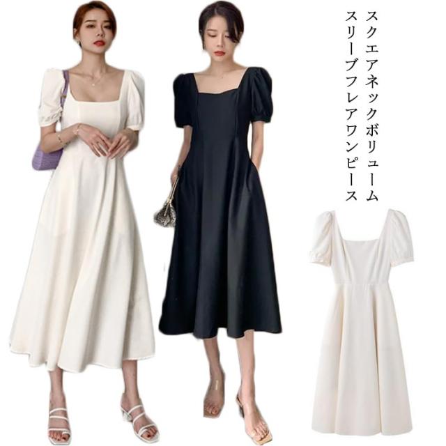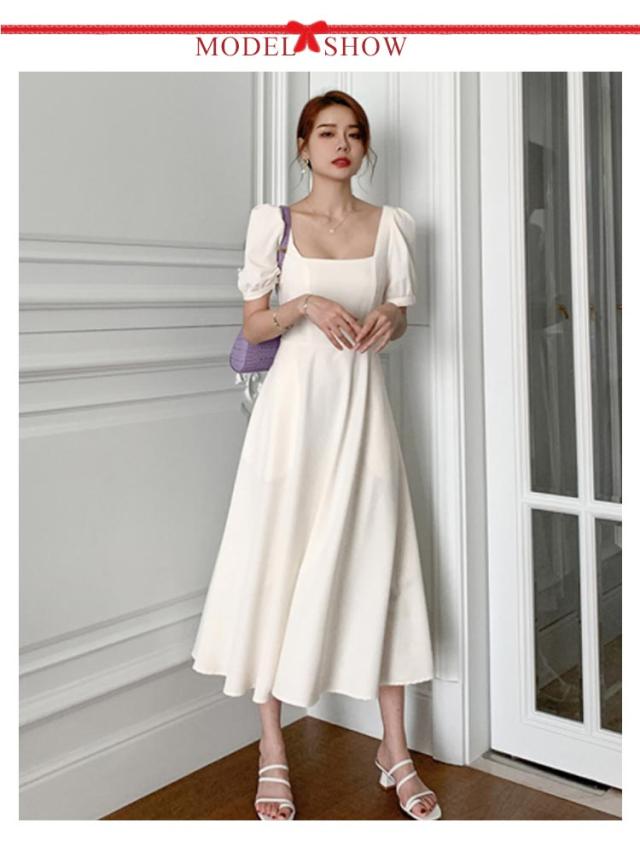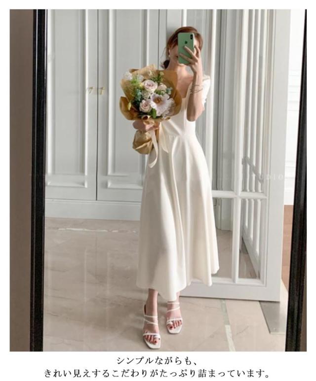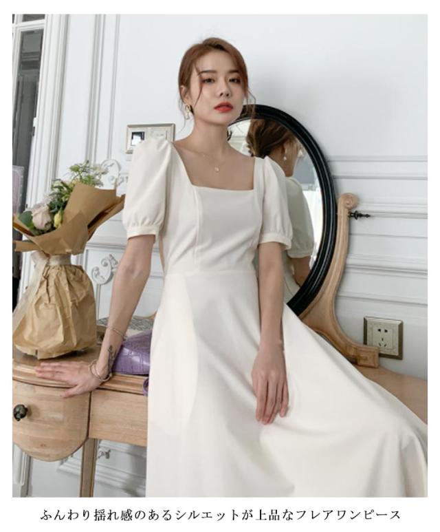 結婚式 ワンピース ドレス パーティードレス スクエアネック 半袖 フレアワンピース aラインワンピース ロング丈 裏地付き 韓国風 ミニマル 白 ホワイト エレガント 発表会 披露宴 お呼ばれ 二次会 デイリー【送料無料】