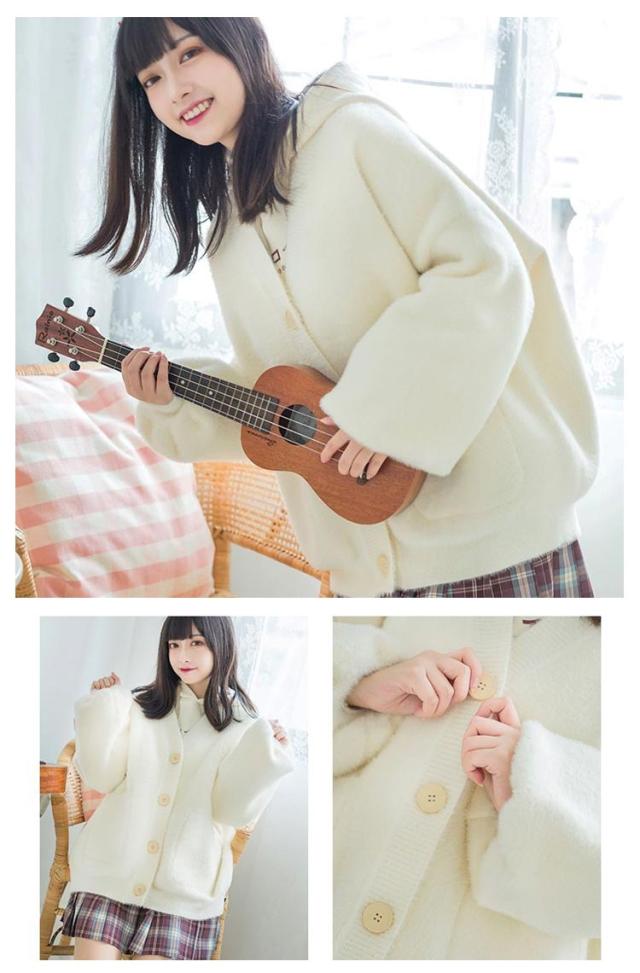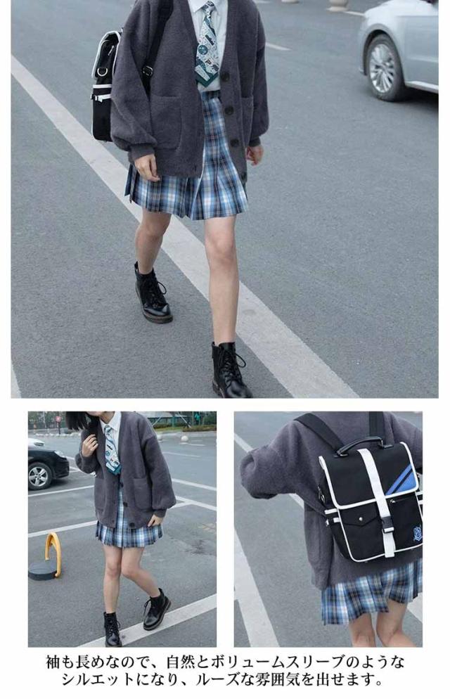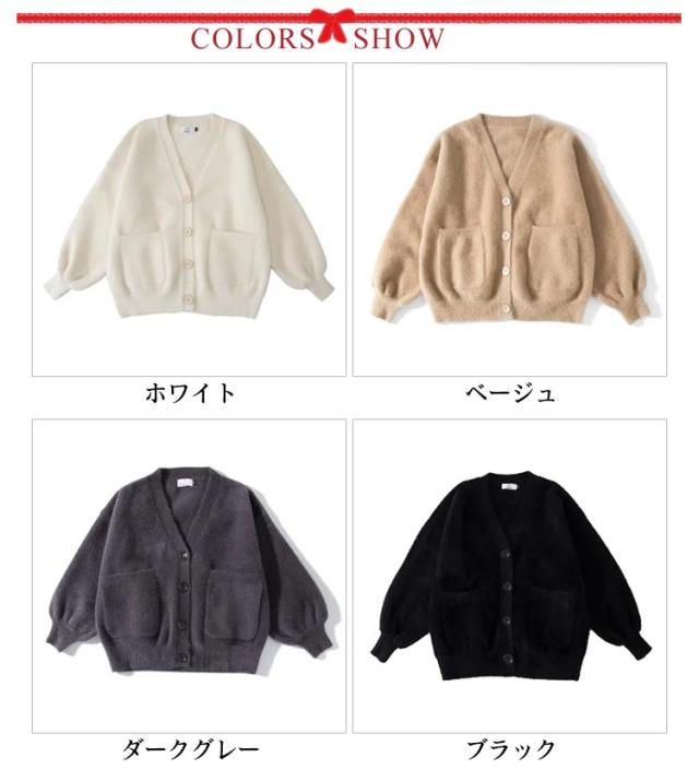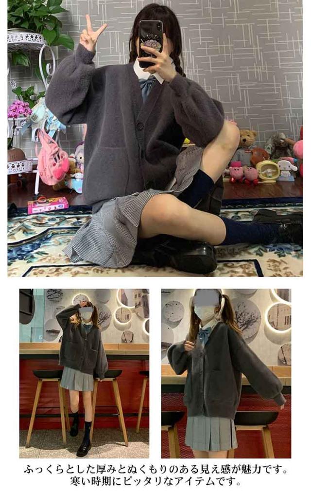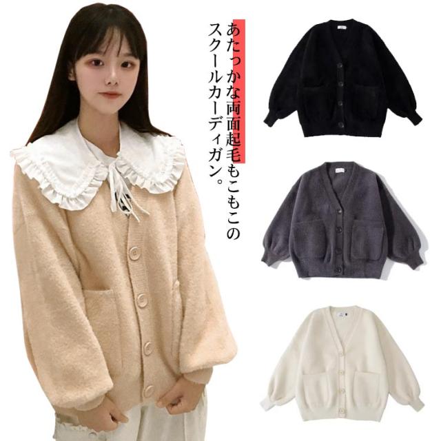 【送料無料】スクールカーディガン 学生服 両面起毛 もこもこ 中学生 高校生 女子 女の子 制服 Vネック ボリューム袖 羽織り アウター ゆったり シャギー ふわふわ 秋服 学校 通学 ホワイト 白 ブラック 黒 かわいい ストレッチ