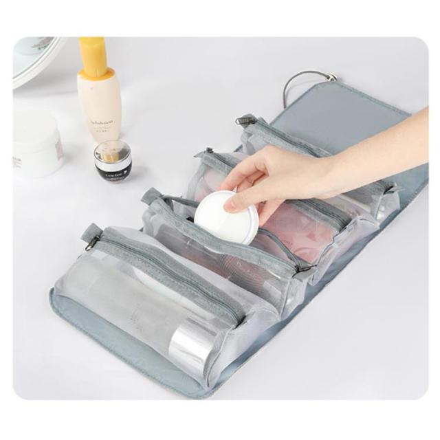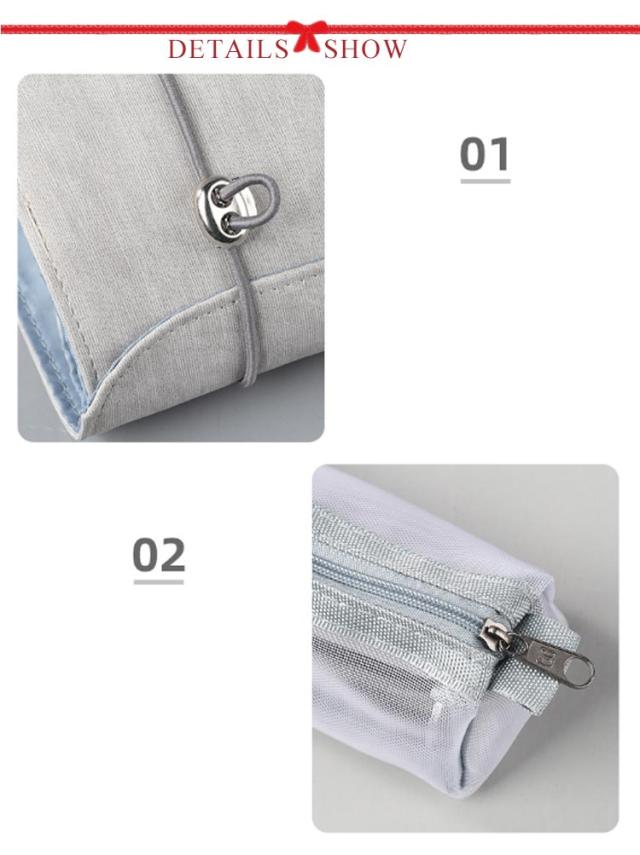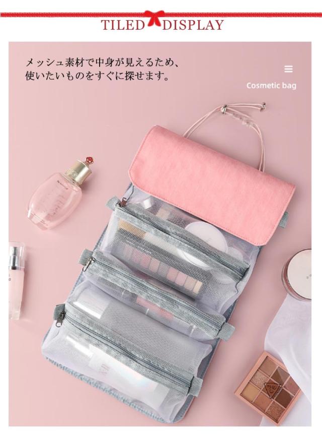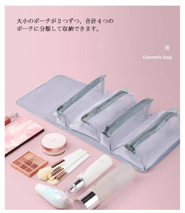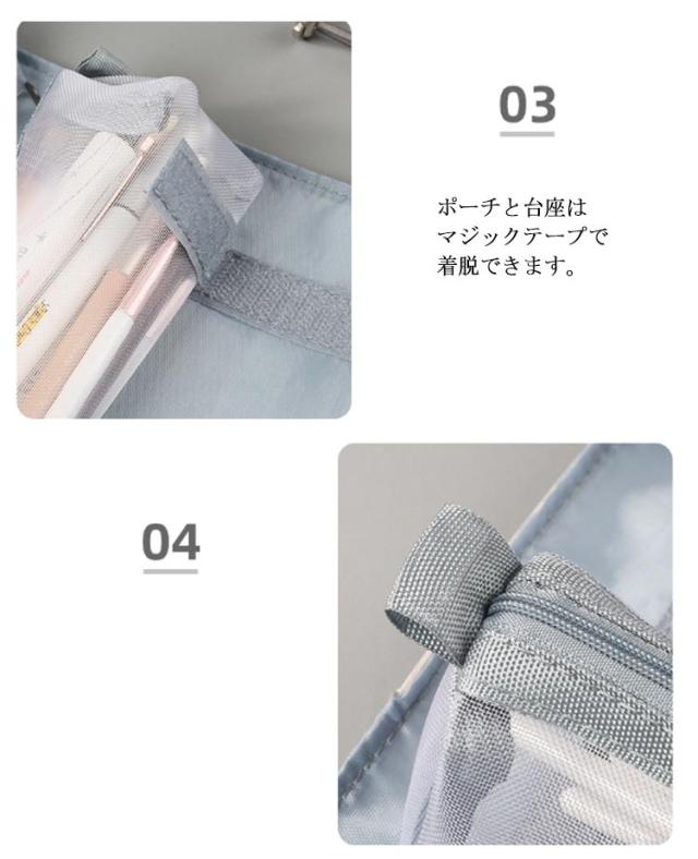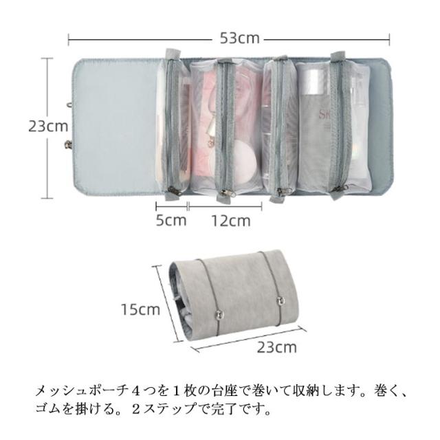 | 4つのメッシュポーチが一つにコンパクトにまとまる便利な折り畳み式ポーチ。 メッシュ素材で中身が見えるため、使いたいものをすぐに探せます。 大小のポーチが2つずつ、合計4つのポーチに分類して収納できます。 ポーチと台座はマジックテープで着脱できます。 メッシュポーチ4つを1枚の台座で巻いて収納します。巻く、ゴムを掛ける。2ステップで完了です。 結構な量を収納出来て、取り外せて、中身の一目瞭然なストレスフリーのポーチです。 | |
