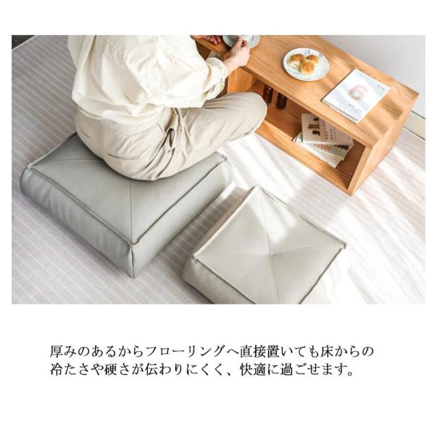 | 和室・洋室どちらでもOK!場所を選ばない万能座布団 しっかりとした厚みのある約14cmのクッションを使用した,、大人が座っても底つき感のない座り心地。 高品質のPUレザーを採用して、こぼしても大丈夫、すぐに拭き取れば後も残りません、お手入れ簡単です。 厚みのあるからフローリングへ直接置いても床からの冷たさや硬さが伝わりにくく、快適に過ごせます。 隠れたファスナーデザインだから、床に傷づかないことにもうれしいポイント。 | |