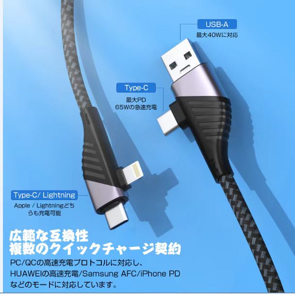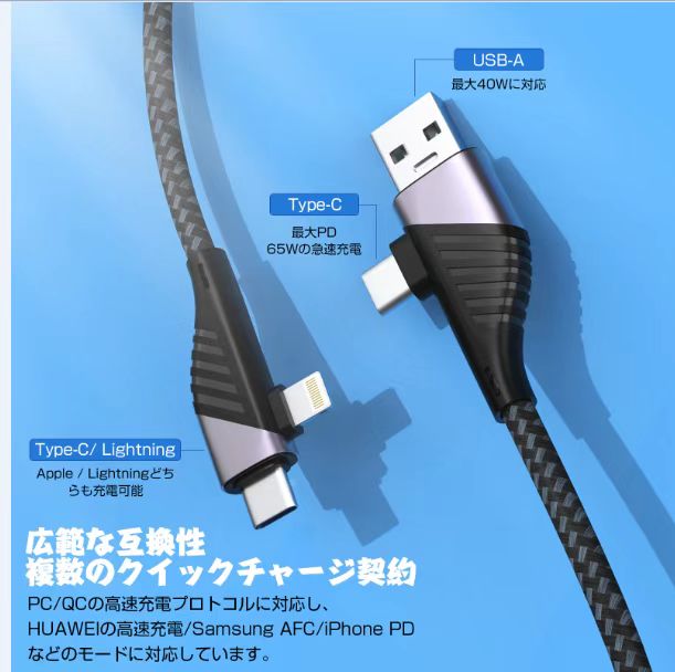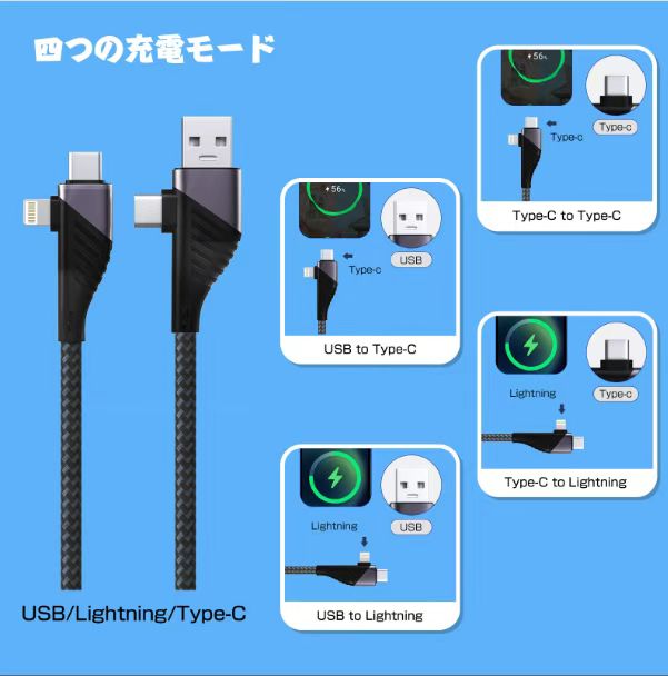 【4in1 充電ケーブル】4つを1つに:USB-C to Lightning ケーブル USB-C to USB-C ケーブル USB-A to Lightning ケーブル USB-A to USB-C ケーブル 。普段外出、旅行、オフィス、車内、出張などに携帯用は大変便利です