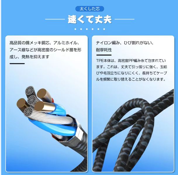 ナイロン編み素材。内部に高品質の銅線を採用し、安全性能が高く、充電速度がより速くなり、充電時間も短縮できます。柔軟性があり、絡まりを防ぎます。しっかりとした構造で耐久性が優れ、強化されたアルミニウム合金シェルジョイントは、断線しにくく、耐摩耗性、耐酸化性、耐傷性があります。