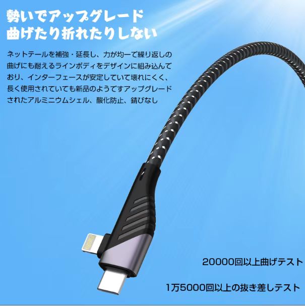 - L字型、4in1が良かったため購入。 コードの繋ぎ目は頑丈で、ちぎれて中の線が出てくることはなくて良かった。 しかしライトニング部の接触が悪く3ヶ月半で寿命を迎えた。