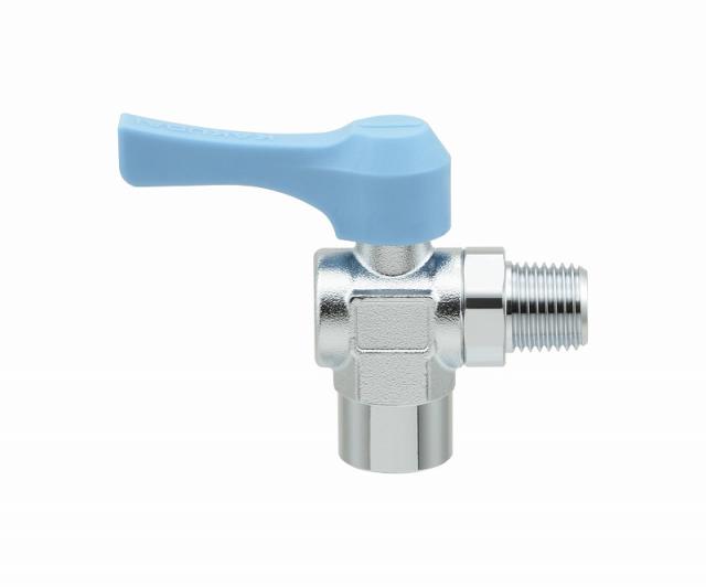 配管やエアー機器などに接続する、アングル型のミニチュアボールバルブです。